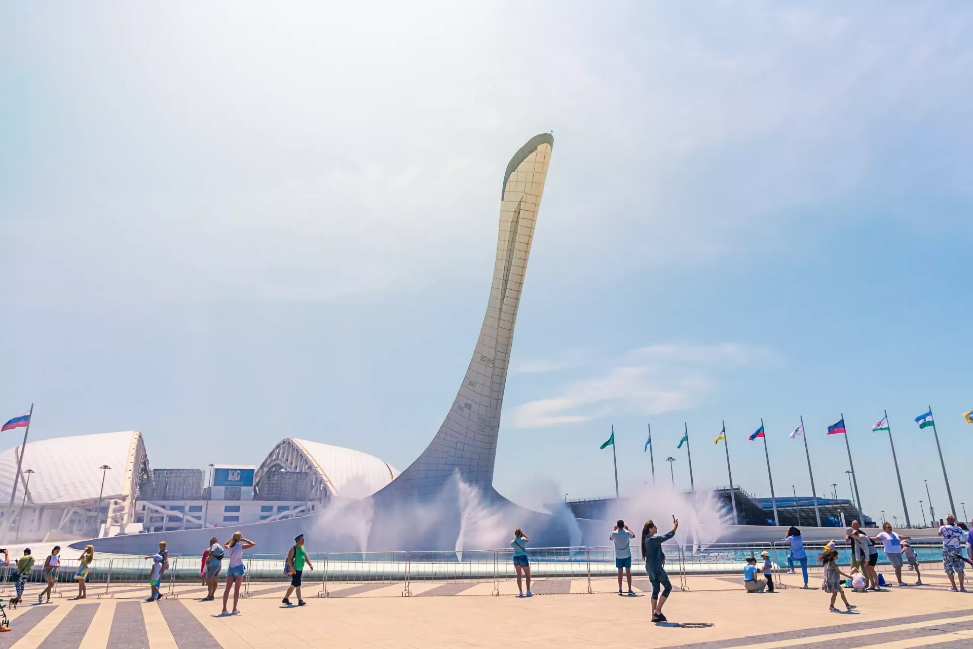 Отдельная достопримечательность Олимпийского парка. Возле стелы-факела находится фонтанный комплекс, где каждый вечер проходит захватывающее музыкальное шоу. Мини-пушки выстреливают струями воды на высоту до 30 м, а самые мощные — аж до 70 м. Каждый фонтан (а всего их 264) подсвечивается своим оттенком — незабываемое зрелище! Поверхность бассейна, куда падают брызги и струи, устилает легкая дымка, усиливая ощущение загадочности.